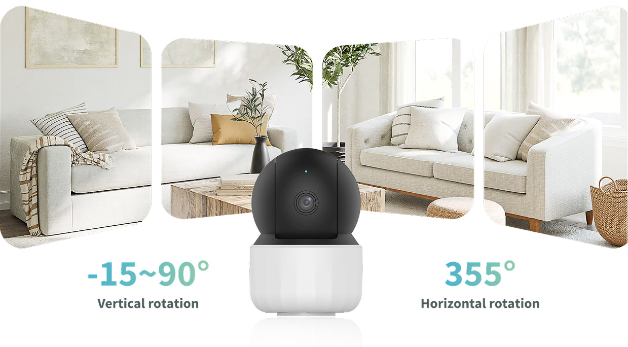 Surveille chaque recoin de votre pièce grâce à une rotation fluide de 355° et une inclinaison de 90°, le tout en qualité 2K HD ultra nette — aucune zone cachée, aucune inquiétude.