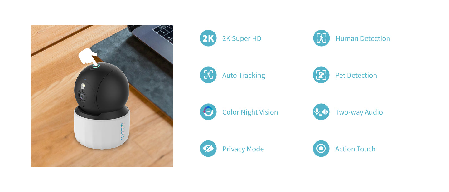 Caméra intérieure 5MP HD avec micro et haut-parleur intégrés, bouton Action Touch pour appel et confidentialité, vision nocturne IR et lumière chaude jusqu’à 10 m, stockage jusqu’à 512 Go, connexion Wi-Fi et installation facile.